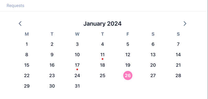 - Below this information, you can see the current month where the date has been requested. If there are multiple dates, you will see a pink circle appear on each date requested. Any red dots will reflect existing leave requests from other employee in that department.